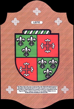 Dom Álvaro Anes Leite, viveu no tempo de Dom João I, Rei de Portugal, de quem foi descendente direto pelo lado materno. Foi senhor de muitas terras na província de Entre Douros e Minho, Alcaide Mor de Monforte do Rio Livre, Comendatário de São Miguel de Réfoios, 1º Conde de Monforte. Por sua Lealdade e fidalguia à Corte, teve seu Brasão de Armas concedido por decreto do Rei. (Transcrição da legenda na base do Brasão) Dom João I foi aclamado rei de Portugal em 6 de Abril de 1.385, o primeiro da dinastia de Avis (1.383/1.580) |